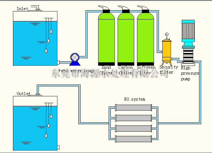 工藝流程:源水箱--給水泵――多介質(zhì)/砂過濾器―――碳過濾器―――軟水器/阻加藥――保安過濾器――高壓泵――-反滲透系統(tǒng)――產(chǎn)品水箱/滲透水箱