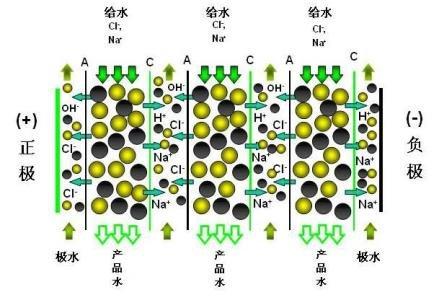 連續(xù)電除鹽(EDI,Electro,deionization或CDI,Continuous Electrode ionization),是利用混合離子交換樹脂吸附給水中的陰陽離子,同時這些被吸附的離子又在直流電壓的作用下,分別透過陰陽離子交換膜而被去除的過程,這一過程中離子交換樹脂是被電連續(xù)再生的,因此不需要使用酸和堿對之再生。